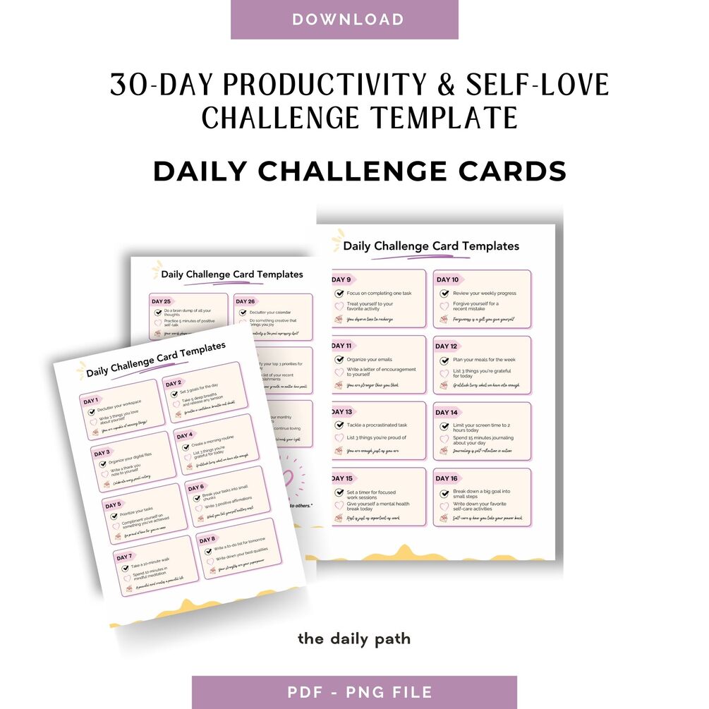 The 30-Day Productivity & Self-Love Challenge is the perfect printable guide for anyone looking to create lasting habits, improve self-care, and stay motivated. This comprehensive challenge combines daily productivity tasks and self-love exercises, giving you all the tools you need to transform your daily routines and mindset.